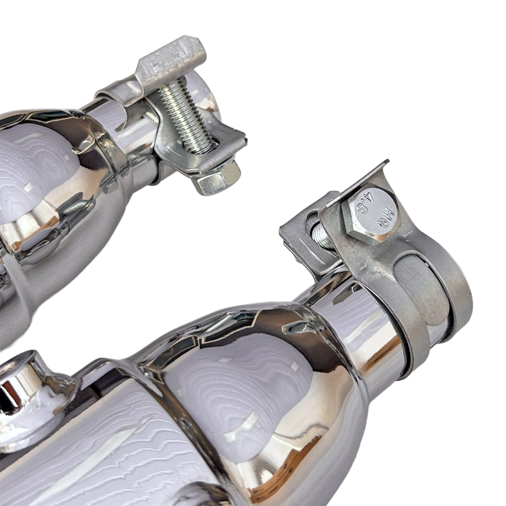 Ponteira 3.5" desenvolvida para a Super Meteor 650 com bocal estilo eliminator, oferecendo um visual mais forte e um acabamento diferenciado, o conjunto conta com abafadores removíveis equipados com manta de lã cerâmica termoacústica, garantindo suavização do som sem perder o grave característico. Além disso, os DB Killers também são removíveis, permitindo escolher entre várias opções de ronco, desde um som mais moderado até um mais esportivo. Produzida pela JM Escapes, uma das marcas mais reconhecidas na linha custom, com excelente acabamento, durabilidade, custo e beneficio e excelente qualificação.